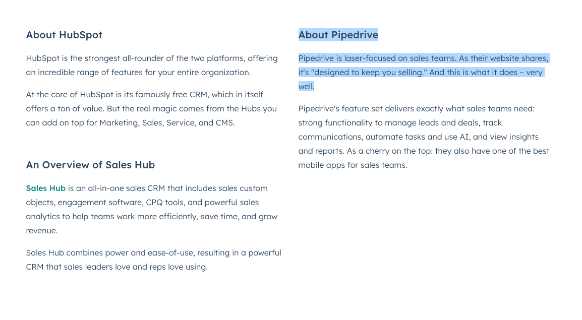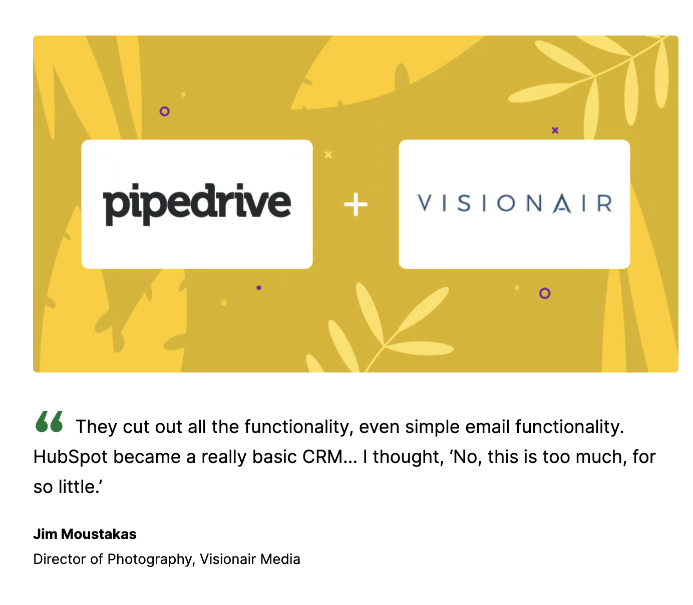 But Pipedrive goes further. They include an in-depth case study on why a different organization became frustrated with HubSpot and decided to move over to Pipedrive: