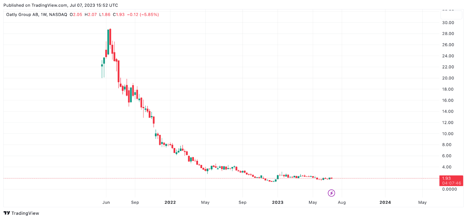You're seeing that right. As of today, in July 2023, Oatly’s share price sits at $1.93 per share. Oatly has lost almost 90% of its value in the last two years.