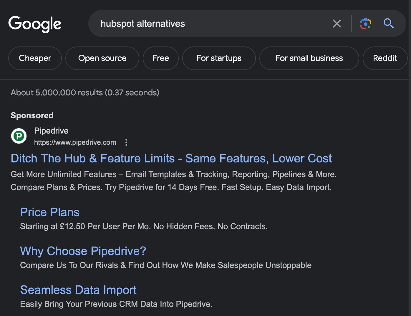 Pipedrive's own Google Ads messaging (see above), brands HubSpot as having “Feature Limits”. The point about being relatively high-cost is the same, but there's no mention of Pipedrive being a more streamlined solution that's easier to use.