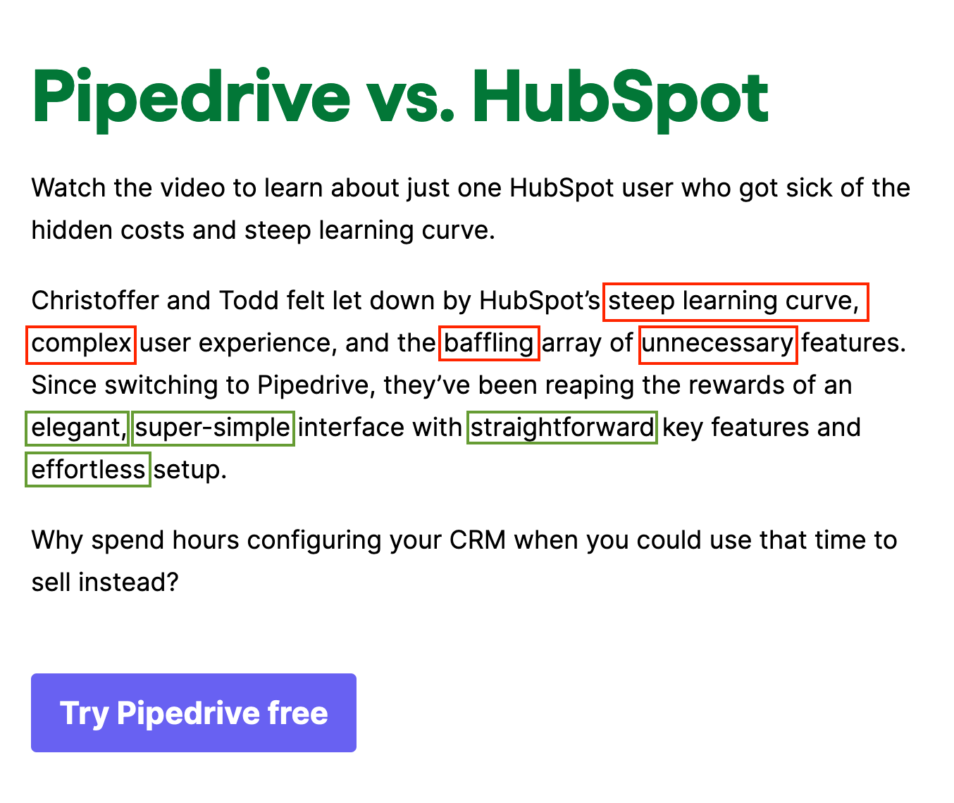 Let’s focus on how Pipedrive plays on market perceptions of HubSpot to position itself as the ideal solution for a couple specific sets of prospects. Namely, those who’ve tried HubSpot and grown frustrated with it, and those who know they want something simple and sales-oriented.