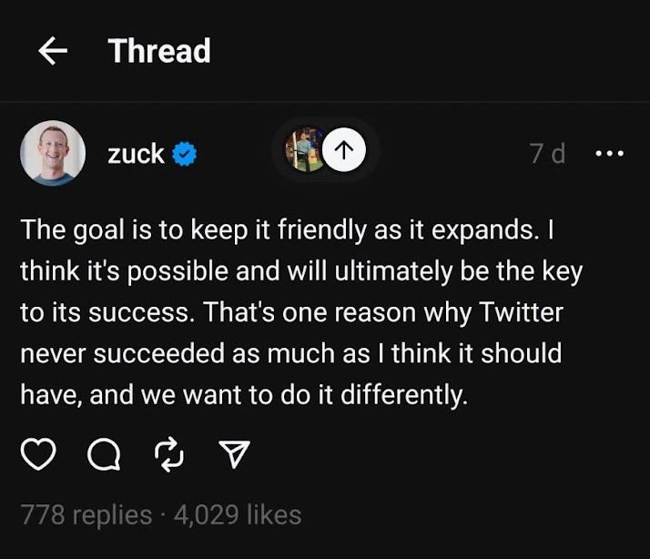 “The goal is to keep Threads friendly as it expands. I think it’s possible and will ultimately be the key to its success. That’s one reason why Twitter never succeeded as much as I think it should have, and we want to do it differently.”