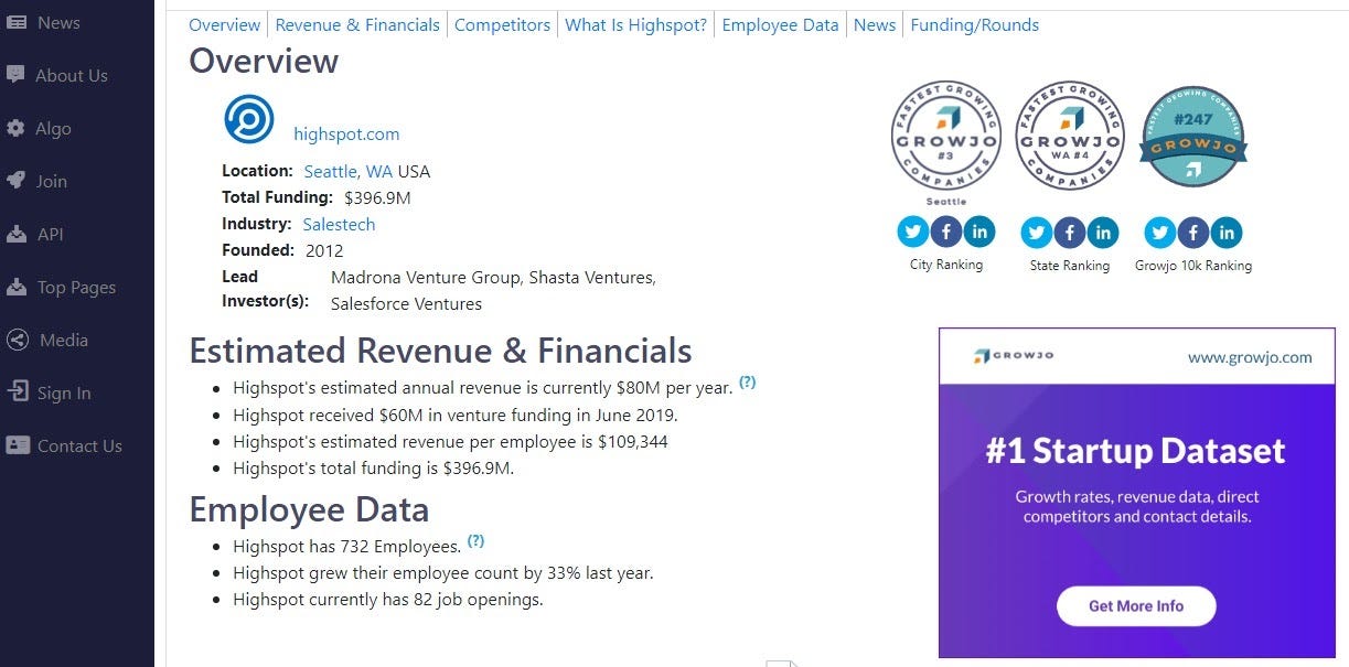 Growjo is another aggregator of information about SaaS companies. It is a free resource. Here is the type of information you can find: