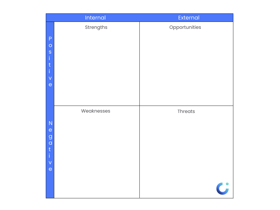The SWOT matrix is a simple table, in a 2 x 2 grid, that shows the four categories of SWOT analysis. It really doesn’t get any more simple than this, but a SWOT matrix can help you visualize the relevant facets of your business according to the SWOT framework.