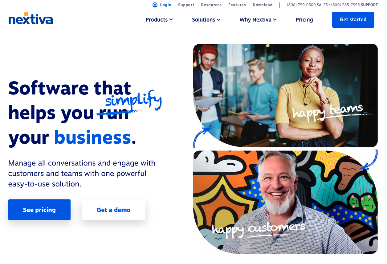 Nextiva puts that experience front and center on its home page, with images of happy faces, happy customers, and a promise that its product will “simplify your business”.